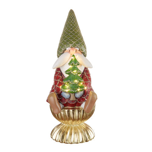 DECORAZIONE DA APPOGGIO- BABBO NATALE SEDUTO CON BASE IN ORO CON ALBERO LED TRA LE MANI (13x16xh.33cm)
